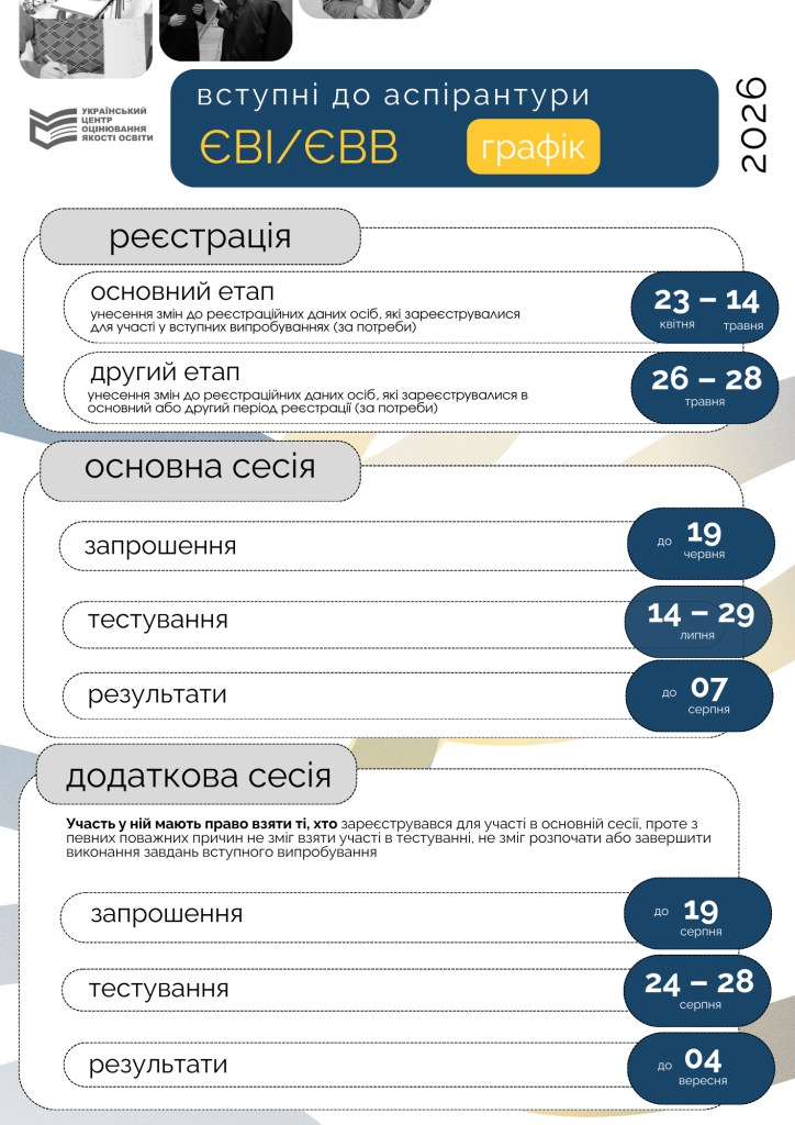До 19 червня учасники, зареєстровані на основну сесію ЄВІ / ЄВВ, отримають на своїх інформаційних сторінках «Кабінет учасника вступних випробувань до аспірантури» запрошення-перепустки, де буде зазначено дату, час і місце проведення тестування, а до 19 серпня – учасники додаткової сесії.