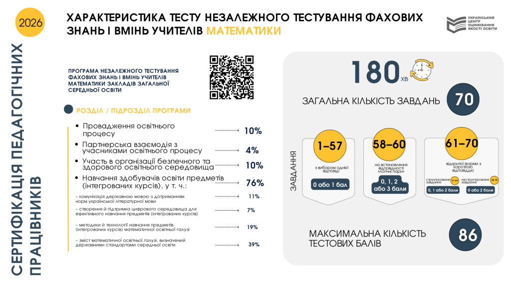 Тест для вчителів математики міститиме 70 завдань трьох форм: з вибором однієї правильної відповіді (57 завдань), на встановлення відповідності («логічні пари») (3 завдання) та відкритої форми з короткою відповіддю (10 завдань), — на виконання яких буде відведено 180 хвилин.