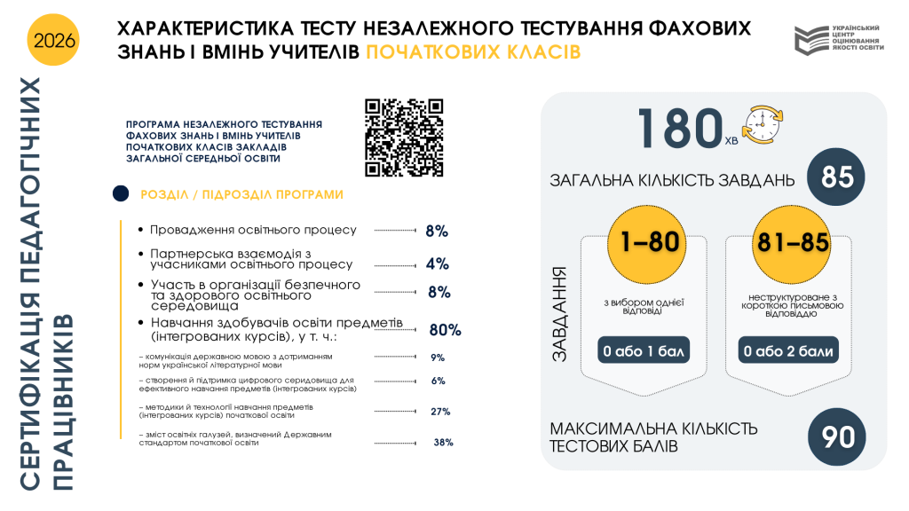 Тест для вчителів початкових класів міститиме 85 завдань двох форм: з вибором однієї правильної відповіді (80 завдань) та відкритої форми з короткою відповіддю (5 завдань), — на виконання яких буде відведено 180 хвилин.