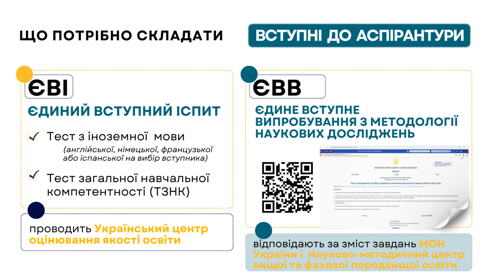 Проєктом Порядку прийому на навчання для здобуття вищої освіти в 2026 році визначено, що охочі вступати на навчання для здобуття ступеня доктора філософії / доктора мистецтва складатимуть єдиний вступний іспит (ЄВІ), а також проходитимуть єдине вступне випробування з методології наукових досліджень (ЄВВ) .