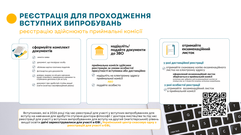 Реєстрацію осіб, які бажають узяти участь у єдиному вступному випробуванні (ЄВВ) та/або єдиному вступному іспиті (ЄВІ), здійснюють приймальні комісії закладів вищої освіти за умови особистої присутності вступника / вступниці та/або дистанційно.