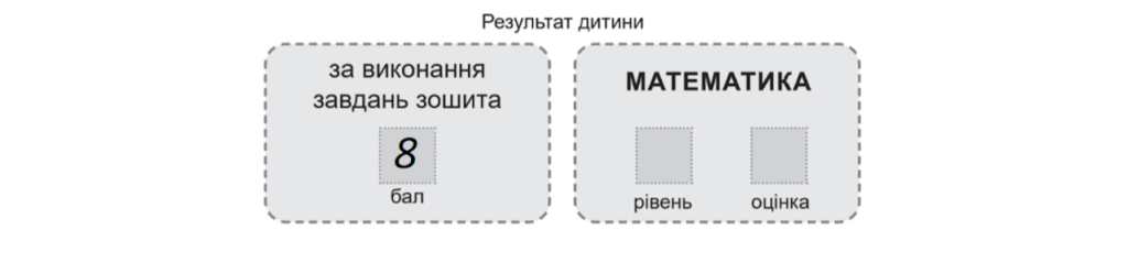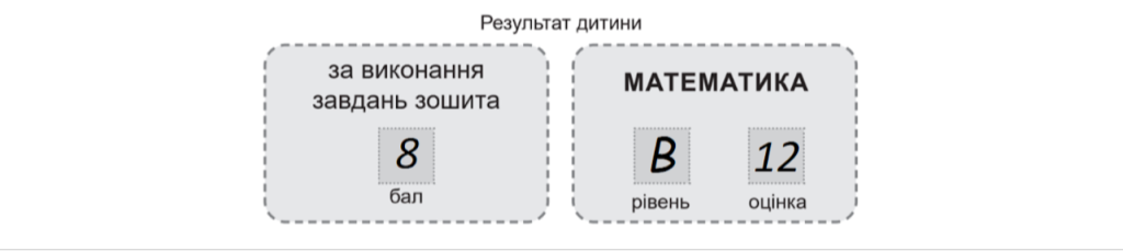 Результат дитини з математики отримується із використанням таблиці переведення балів, отриманих за виконання завдань частини 1 та частини 2 ДПА з математики, у рівні навчальних досягнень та оцінки за шкалою 1–12 (Додаток 2). Цей результат фіксують у відповідних комірках (див. приклад 4).