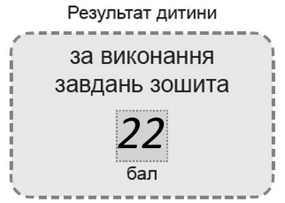 Після перевірки всіх завдань бали, отримані дитиною за виконання завдань, переносяться у таблицю, подану наприкінці зошита (див. приклад 2) та обчислюється загальний бал.
