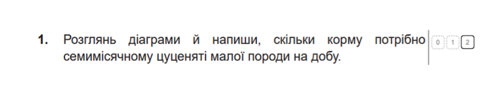 Наприклад, завдання 1 передбачає роботу дитини з діаграмою: знаходження потрібної діаграми, читання її та відбір даного (масу корму), яке є відповіддю на запитання. У цьому завданні частково правильною є відповідь, яка свідчать про те, що дитина скористалась не тією діаграмою, що потрібна за умовою, однак знайшла на ній дане (масу корму на добу) для семимісячного (шестимісячного) цуценяти.