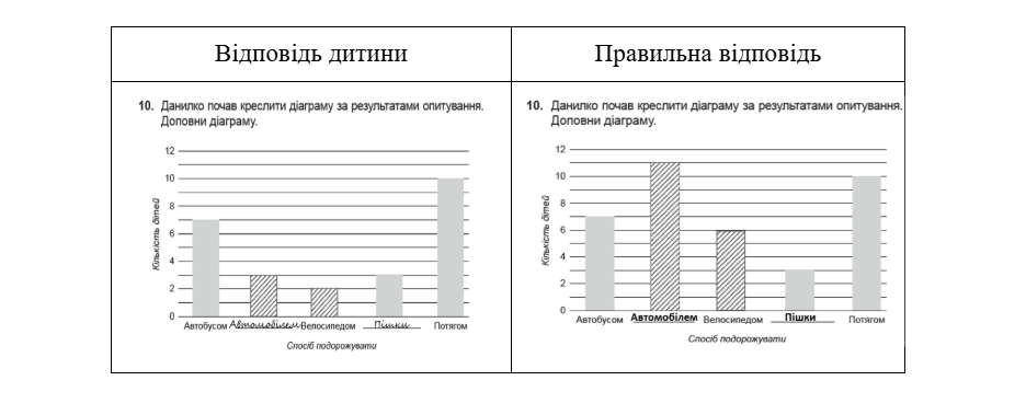 Так, у завданні 10 усі чотири правильні відповіді (підписи та зображення стовпчиків діаграми) оцінюють 2 (двома) балами, дві-три правильні відповіді (підписи, зображення стовпчиків діаграми) – 1 (одним) балом, одну правильну відповідь (підпис чи зображення стовпчика діаграми) або жодної – 0 балів.