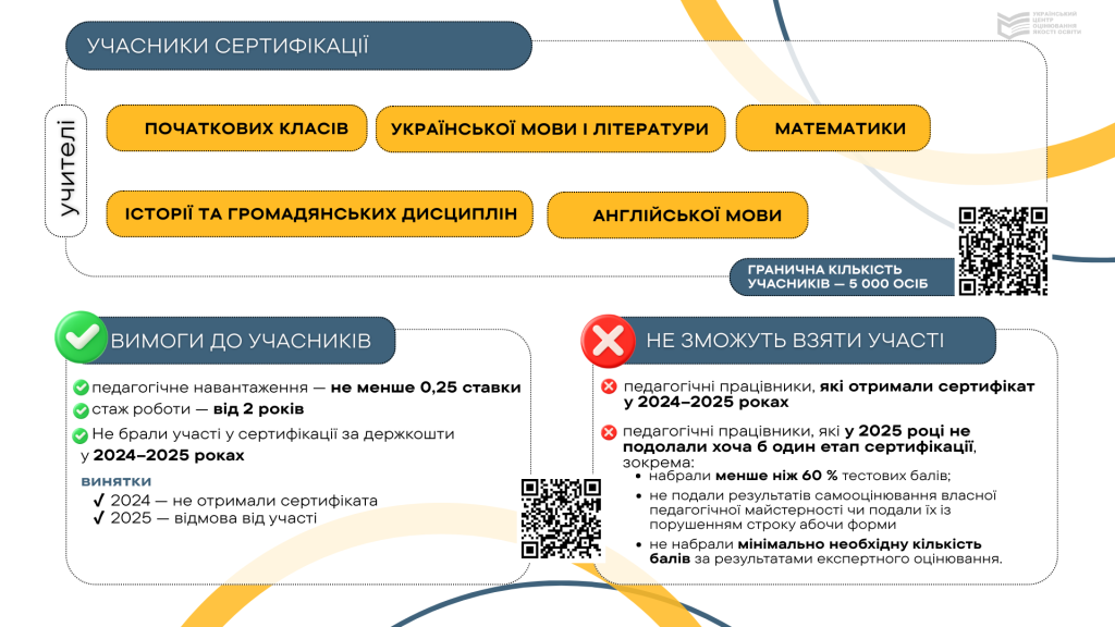 Для участі в сертифікації зможуть зареєструватися вчителі, які мають на день початку реєстрації педагогічне навантаження за категорією педагогічних працівників, для участі в сертифікації з якої реєструються, не менше ніж 0,25 тарифної ставки, стаж педагогічної роботи не менше ніж 2 роки та не брали участі в сертифікації за рахунок коштів державного бюджету протягом 2 попередніх років (крім учителів, які у 2024 році, брали участь у сертифікації, але не отримали сертифіката, а також які в минулому році реєструвалися для участі в сертифікації, але відмовилися від її проходження).